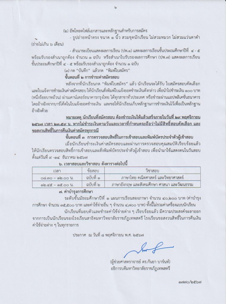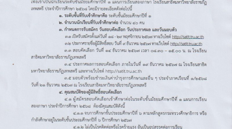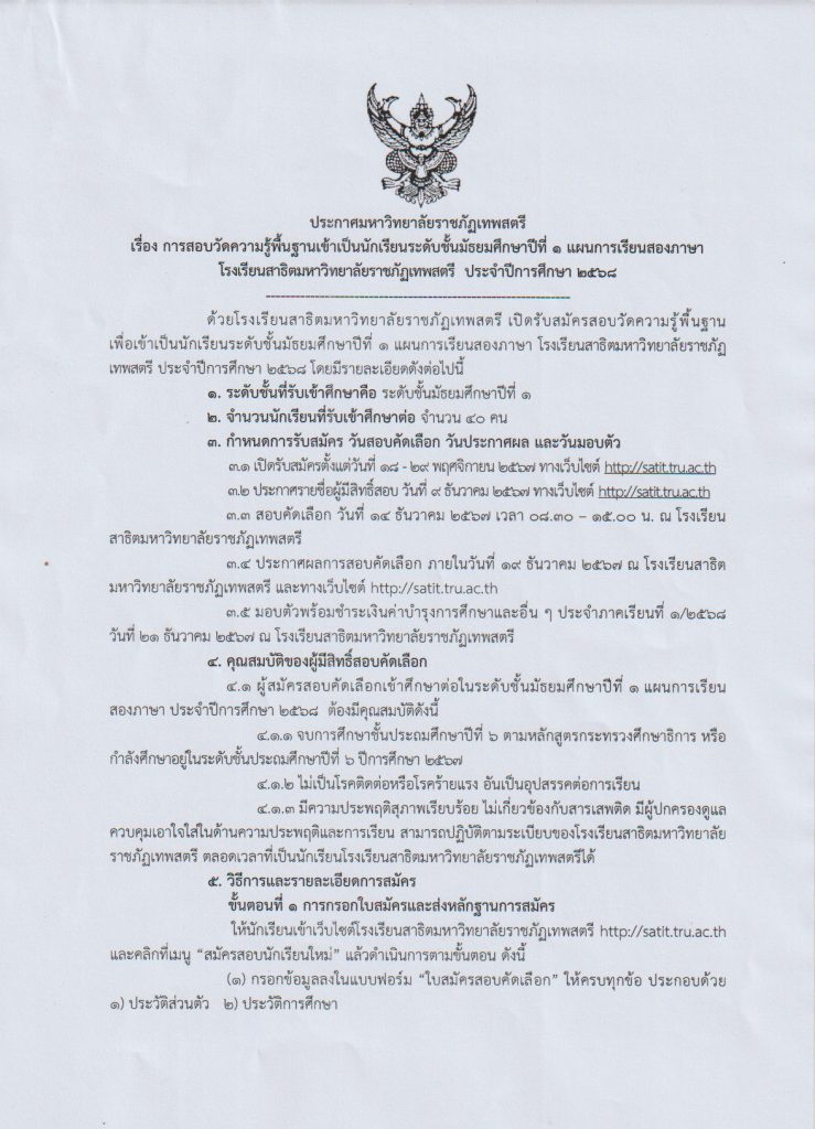 ประกาศมหาวิทยาลัยราชภัฏเทพสตรี เรื่อง การสอบวัดความรู้พื้นฐานเข้าเป็นนักเรียนระดับชั้นมัธยมศึกษาปีที่ ๑ แผนการเรียนสองภาษา โรงเรียนสาธิตมหาวิทยาลัยราชภัฏเทพสตรี ประจำปีการศึกษา ๒๕๖๘
