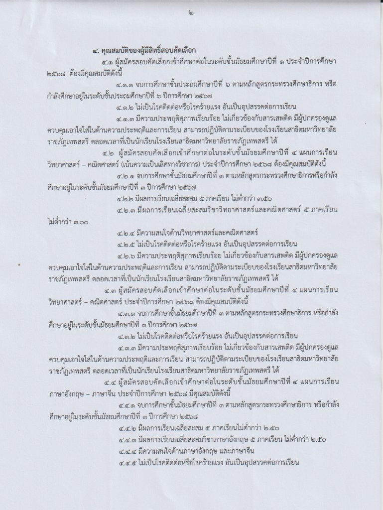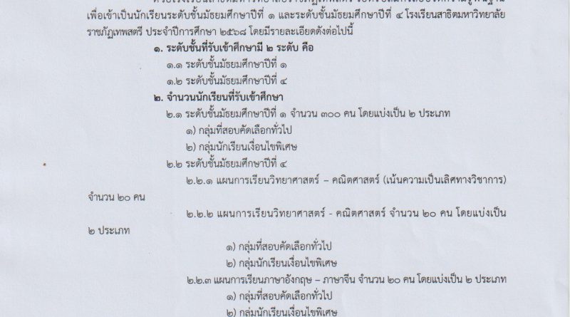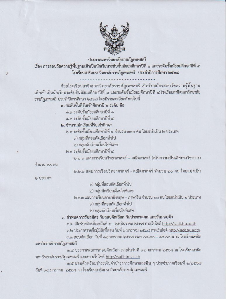 ประกาศมหาวิทยาลัยราชภัฏเทพสตรี เรื่อง การสอบวัดความรู้พื้นฐานเข้าเป็นนักเรียนระดับชั้นมัธยมศึกษาปีที่ ๑ และระดับชั้นมัธยมศึกษาปที่ ๔ โรงเรียนสาธิตมหาวิทยาลัยราชภัฏเทพสตรี ประจำปีการศึกษา ๒๕๖๘ (รอบทั่วไป)